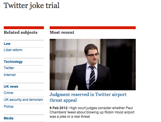 As a consequence of posting this tweet he has lost his job, twice, and been convicted of ‘sending a message of menacing character’. The tweet is obviously a joke and would be taken as such by anyone who has any clue about British humour. Here’s a link to the back story as reported by the Guardian.